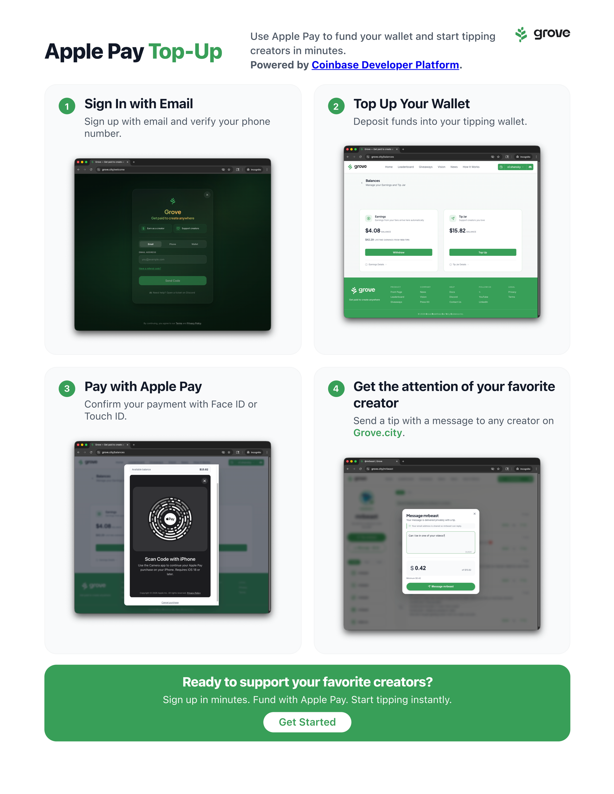 We've been working closely with our partners at Coinbase Developer Platform to integrate Apple Pay directly into Grove.